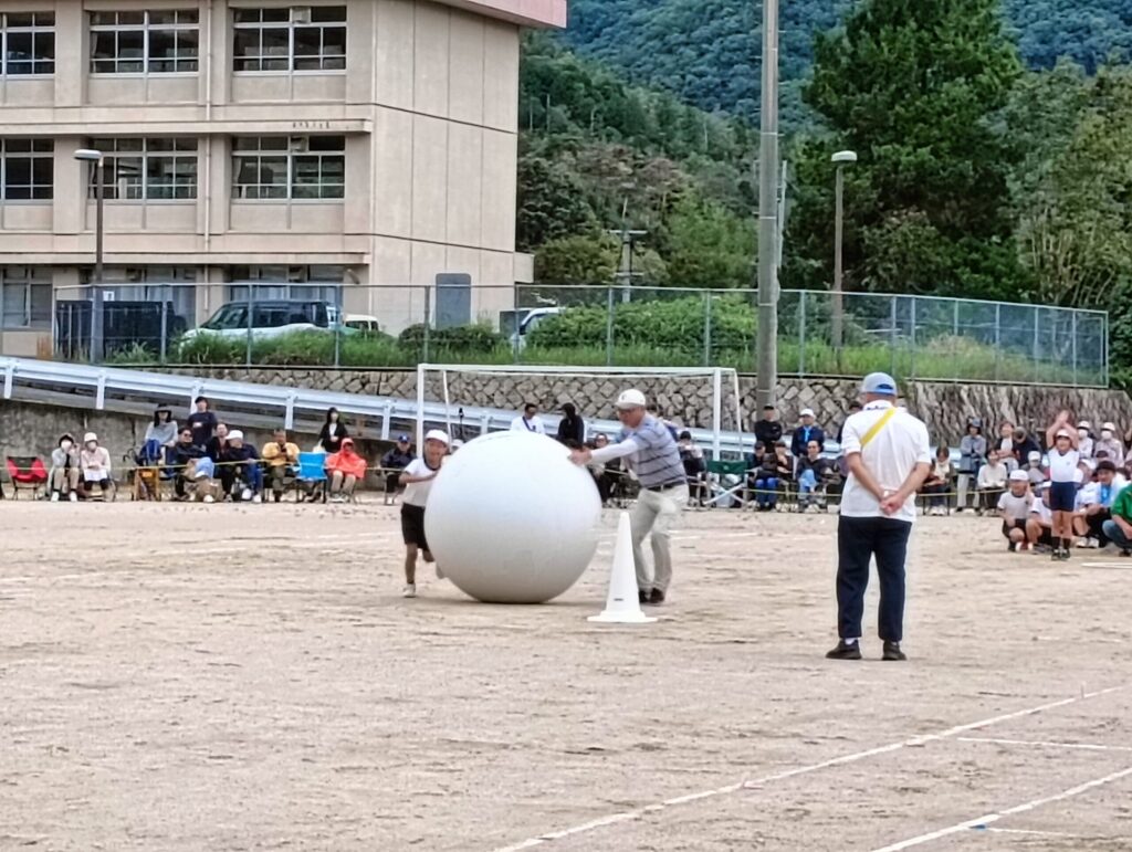 二人一組で大きな玉を転がしていくリレーです。一生懸命息を合わせてがんばりました!