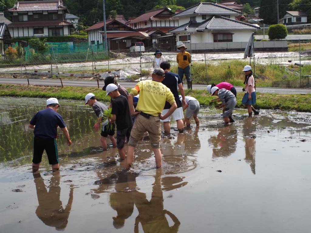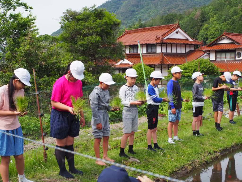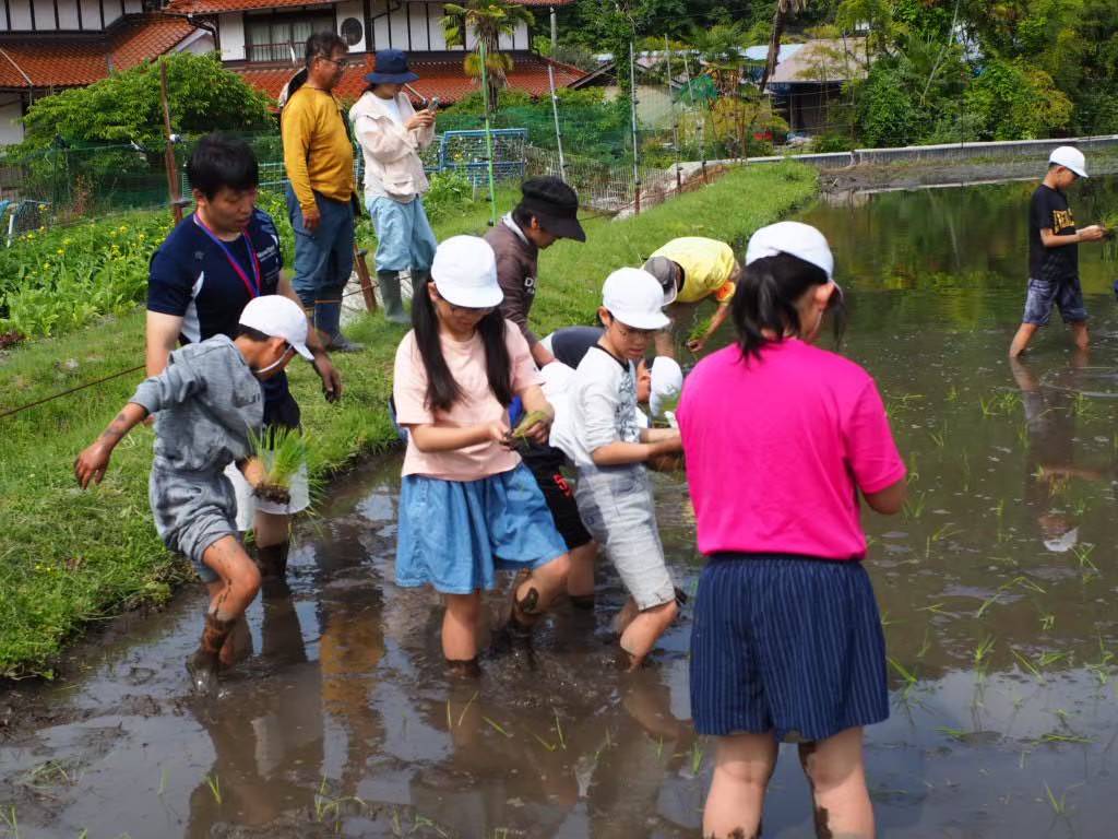 地元の小学校の児童が、高南地区の自然豊かな環境の中で、田植えから稲刈り、餅つきまで1年を通じて