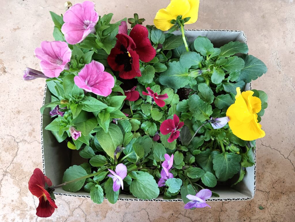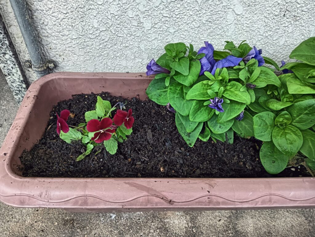 左が新しく仲間入りしたビオラ、右が成長したペチュニアです。