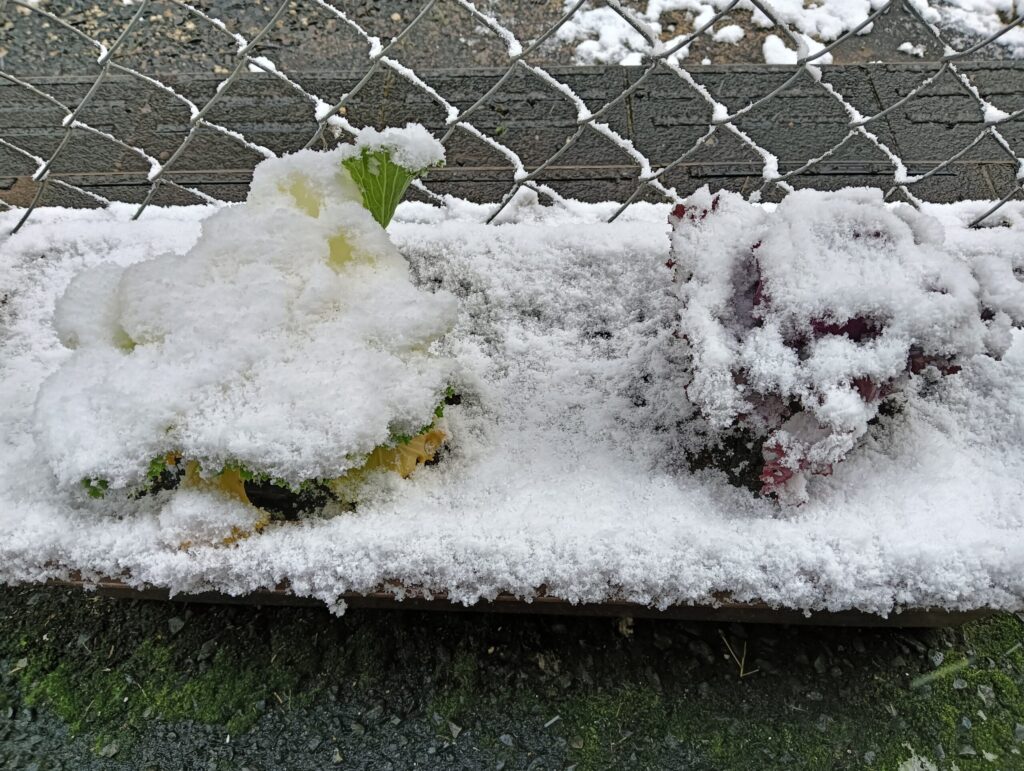 花いっぱい活動第1回目に植えた葉牡丹が、雪をまとっていました。
